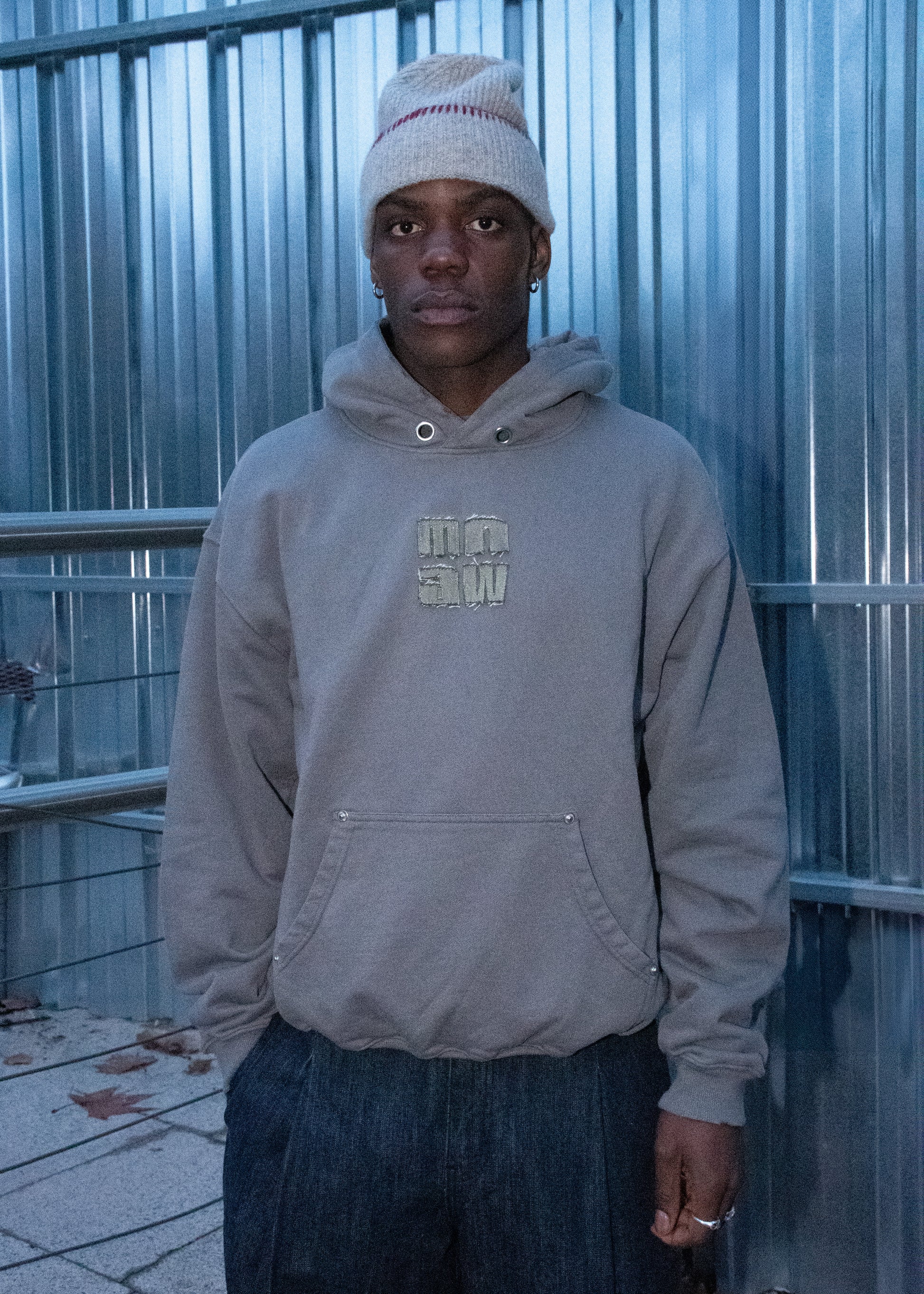 Logo cortado y confeccionado en upcycled denim con acabado en relieve.